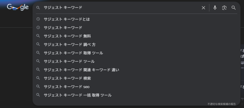 サジェストKWとは、検索した際に表示される「予測キーワードの候補」の事。
