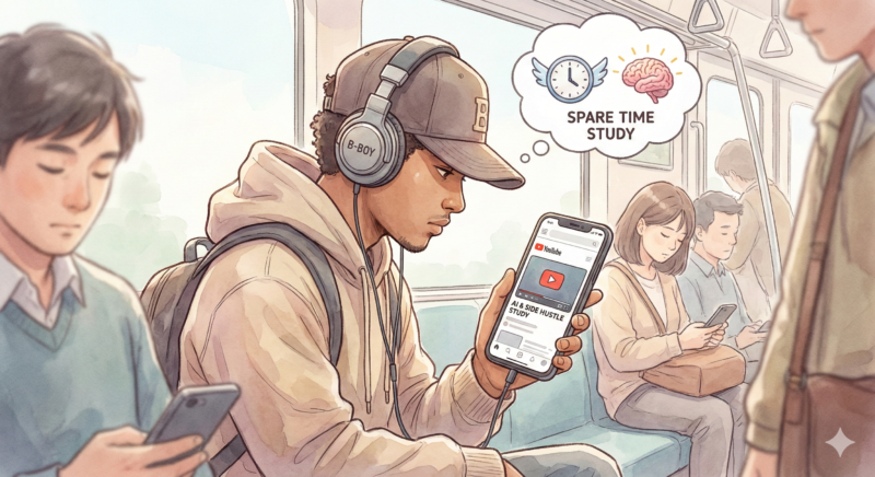 通勤・退勤中の電車や車の中で、AIや副業に関するYoutube動画を見る。