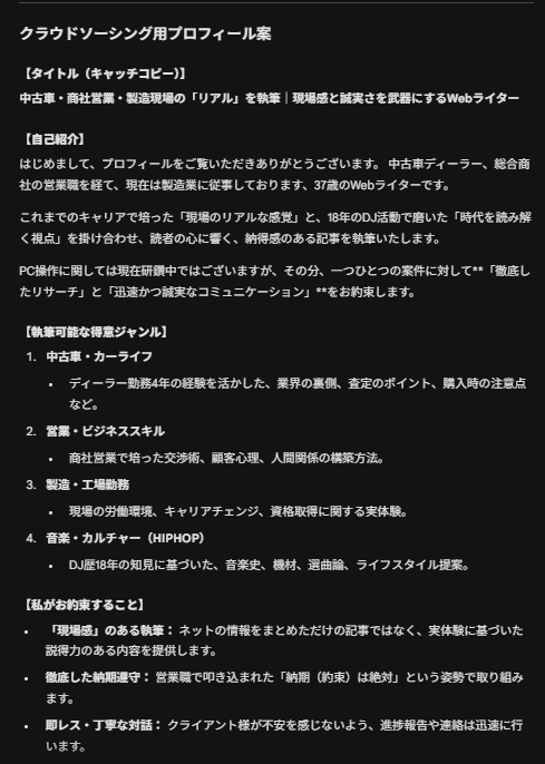 AIの論理的で読みやすい構成と、あなたの情熱がMIXされたプロフィール。
